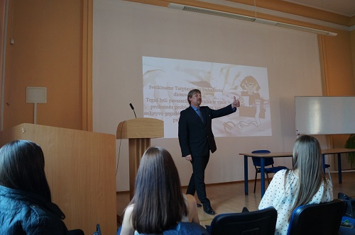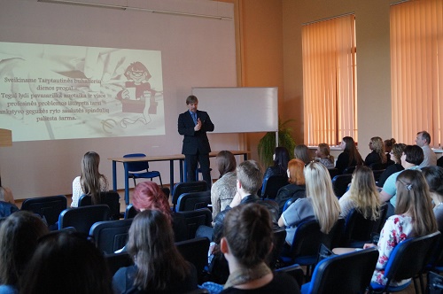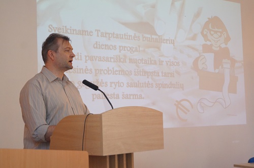 Visus susirinkusiuosius su Tarptautine buhalterio diena pasveikino Mykolo Romerio universiteto Ekonomikos ir finansų valdymo fakulteto dekanas prof. Gintaras Černius, kuris charizmatiškai pristatė temą „Buhalterio vaidmuo įmonių finansų valdyme“. Pranešėjas apibrėžė šiuolaikinio buhalterio poziciją darbe, pastebėjo, jog šiandien buhalteris yra įmonės savininkų partneris, kuriantis bei palaikantis įmonės vertę. Įdomu pastebėti, jog buhalterija sulyginama su simfonija, t. y., be gero buhalterio įmonė veiks neorganizuotai, padrikai, kaip ir atskiri garsai nesuformuojantys skambios melodijos. Susirinkusius studentus su studijų galimybėmis MRU supažindino Rinkodaros ir priėmimo skyriaus vedėjas Saulius Bugailiškis.