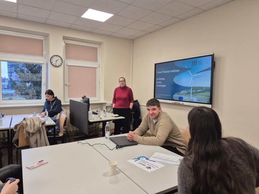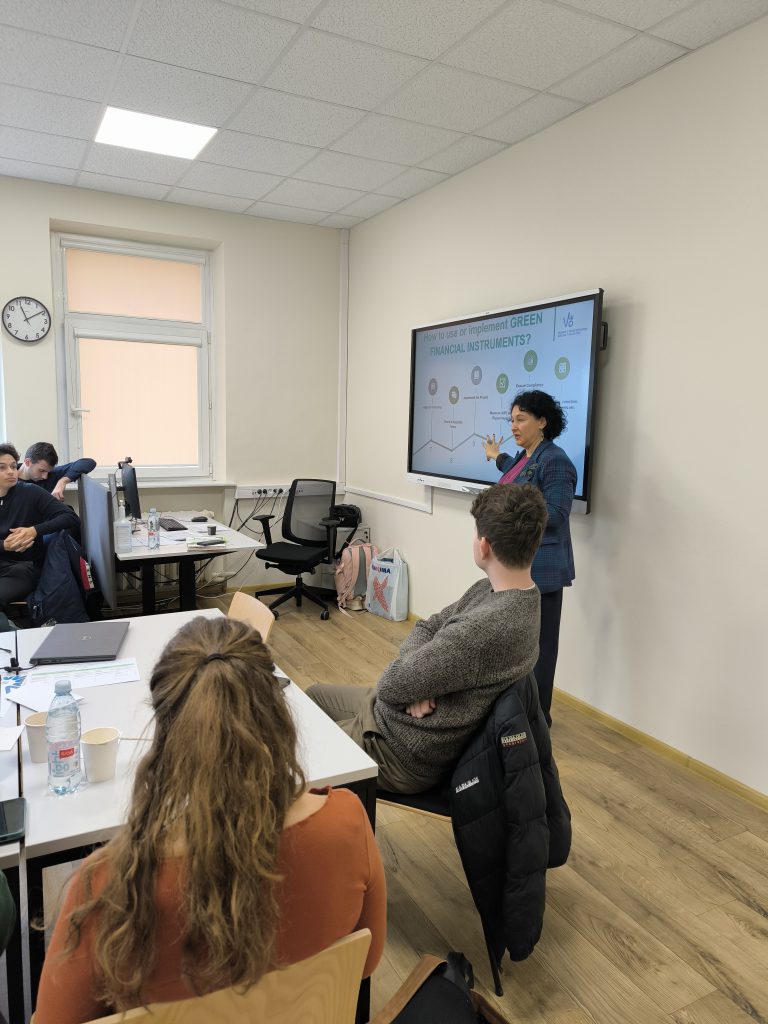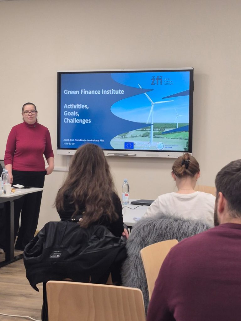 Pirmadienį studentai klausėsi UAB „Ilte“ atstovės, finansų analitikės, dr. Noros Marijos Laurinaitytės pranešimo apie Žaliųjų finansų institutą – tema, kurios pagrindiniai principai lydėjo visą savaitę.
