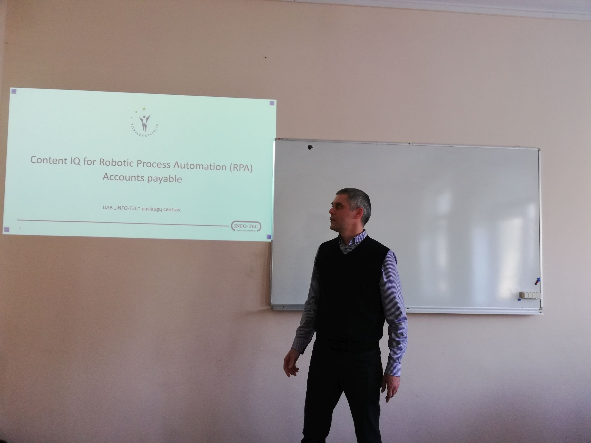 2019 m. balandžio 8 d. Buhalterinės apskaitos katedros lektorė Birutė Jukonienė pakvietė į fakultetą UAB „INFO-TEC“ paslaugų centro atstovą Marių Ramanauską paskaityti studentams paskaitą „Apskaitos procesų automatizavimas įmonėse“. Paskaitą klausę BA17C gr. studentai įsitikino, kad kiekvienas verslo lyderis, siekdamas optimizuoti dokumentų, o ypač buhalterinės apskaitos dokumentų, paieškos, skaitmeninimo ir duomenų įvedimo procesus bei efektyviai valdyti dokumentus, įmonės informacinėms technologijoms teikia strateginę reikšmę. „INFO-TEC“ atstovas M. Ramanauskas apibendrindamas paskaitą teigia: „Apskaitos procesų automatizavimas, panaudojant dokumentų klasifikavimo ir duomenų atpažinimo technologijas, padeda greičiau apdoroti dokumentus, užtikrina duomenų kokybę ir proceso skaidrumą, mažina kaštus. ABBYY „FlexiCapture for Invoices“ sprendimas yra vienas iš geriausių rinkoje įrankių sąskaitų duomenų įvedimo automatizavimui. Realiu laiku pateikiami duomenys apskaitai, ataskaitų formavimui ir analizei leidžia priimti savalaikius sprendimus ir didina organizacijos konkurencinį pranašumą“.