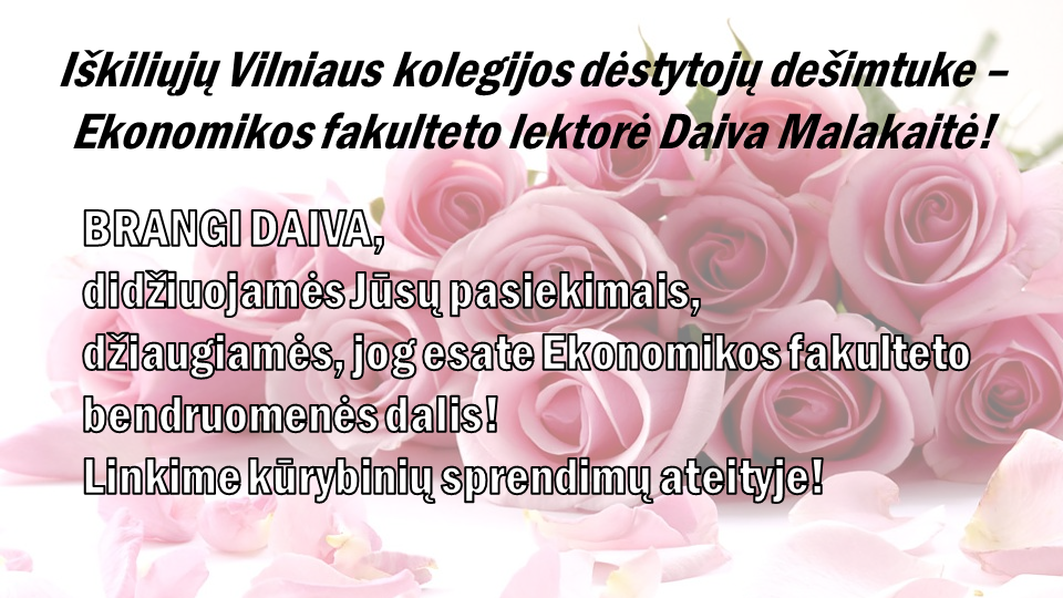 Džiaugiamės, kad į Vilniaus kolegijos IŠKILIŲJŲ DĖSTYTOJŲ dešimtuką įtraukta Ekonomikos fakulteto lektorė, Draudimo katedros vedėja DAIVA MALAKAITĖ!