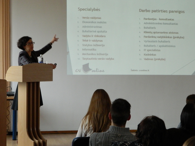 CV-Online LT, UAB Marketingo vadovė Rita Karavaitienė skaitė paskaitą „Ką gali padaryti tuoj, neatidėliok rytoj“. Pranešėja paminėjo geidžiamiausias sritis, į kurias pretenduoja ieškantieji darbo, bei populiariausias darbdavių siūlomas pozicijas. Dažniausiai šios kryptys ženkliai prasilenkia sukeldamos aibę rūpesčių darbo rinkoje. Pranešėja pateikė visą eilę patarimų ieškant darbo ir savęs darbo rinkoje.
