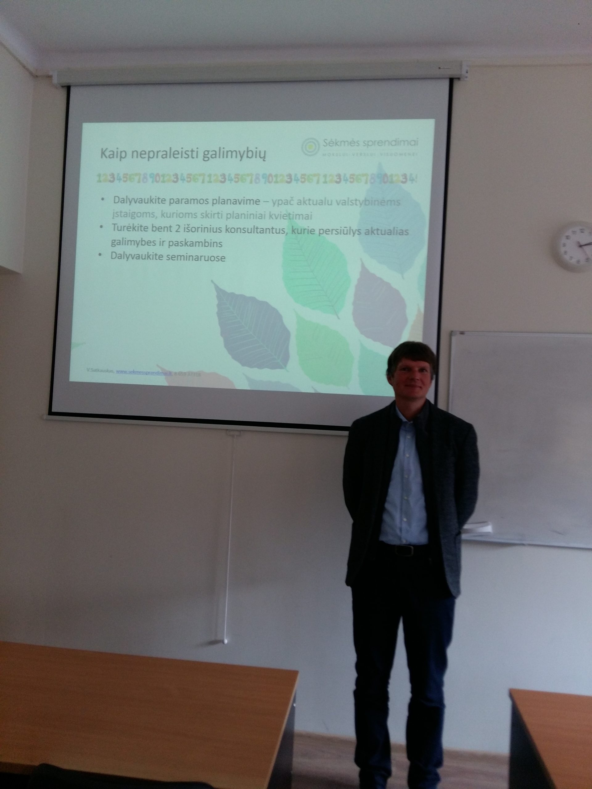 Tokia tema, lapkričio 8 d. Verslo ekonomikos trečiakursiams paskaitą skaitė UAB „Verslo sprendimai“ direktorius Vismantas Satkauskas. Lektoriaus nuomone, prieš pradedant verslą reikėtų atsakyti į šiuos klausimus: ar pakankamai išmanau dalykinę sritį ir gebėsiu savarankiškai užtikrinti paslaugų kokybę? Ar man bus reikalinga pagalba? Kaip rasiu klientus? Ar identifikavau tikslinį segmentą? Ar įvertinau konkurenciją veiklos srityje? Kaip ieškosiu darbuotojų ir juos motyvuosiu? Ar gebėsiu parduoti paslaugas už rinkos kainą? Ar gebėsiu užtikrinti pakankamai mažas sąnaudas?