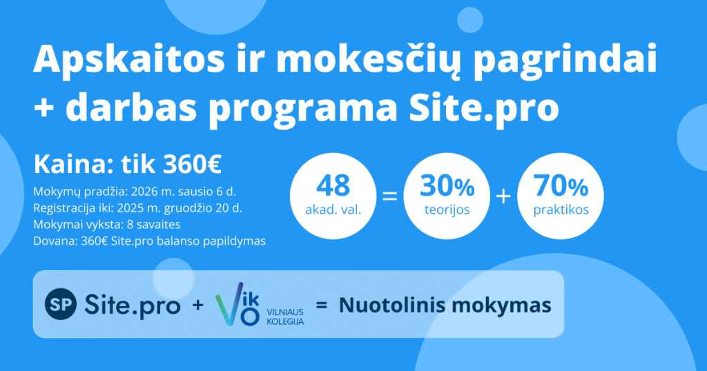 Kviečiame registruotis į nuo 2026-01-06 vyksiančius mokymus „Apskaitos ir mokesčių pagrindai + darbas programa Site.pro“. Mokymų metu bus dirbama su šiuolaikine apskaitos programa Site.pro (buvusi B1.lt). Mokymus veda patyrę bei kompetentingi Ekonomikos fakulteto lektoriai. Registracija vyksta iki 2025 m. gruodžio 20 d.