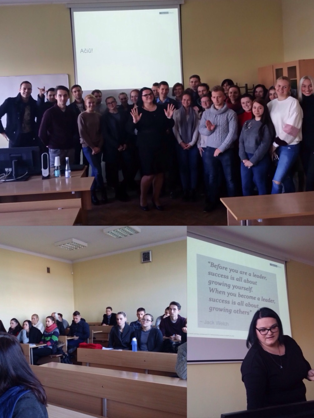 Susitikimo metu buvo supažindinta su lyderystės principais ir vadovavimo aspektais, kurie studentams ateityje gali būti reikalingi norint įsidarbinti banko padaliniuose bei siekti karjeros galimybių vadovo pozicijose. Lektorė iškart atrado ryšį su studentais, tad seminare netrūko ir diskusijų apie lyderystę.