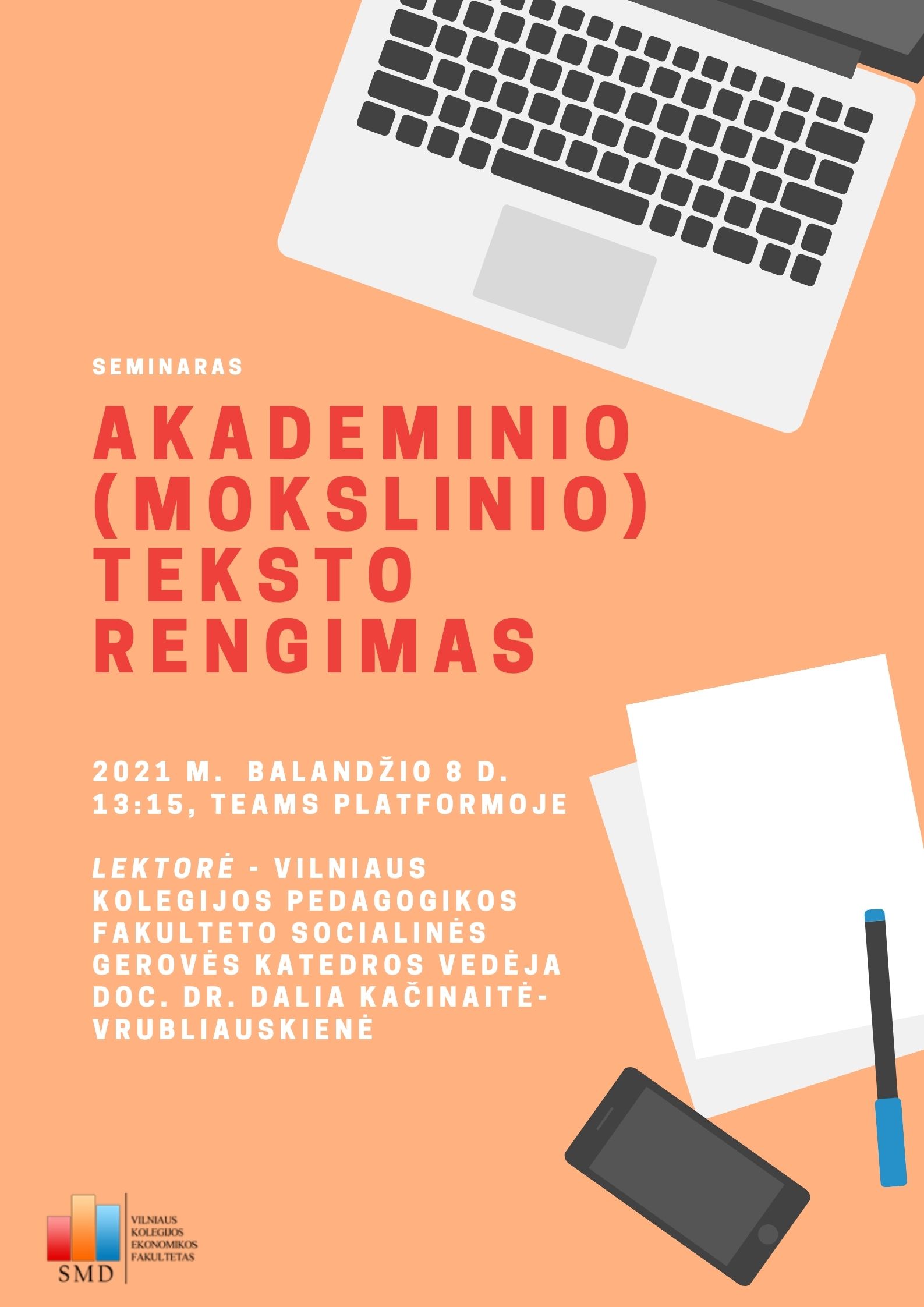 Ekonomikos fakulteto studentų mokslinė draugija (EKF SMD) per MS Teams platformą organizuoja seminarą studentams ir dėstytojams „Akademinio (mokslinio) teksto rengimas“, kuris vyks 2021 m. balandžio 8 d. (ketvirtadienį) 13.15 val.