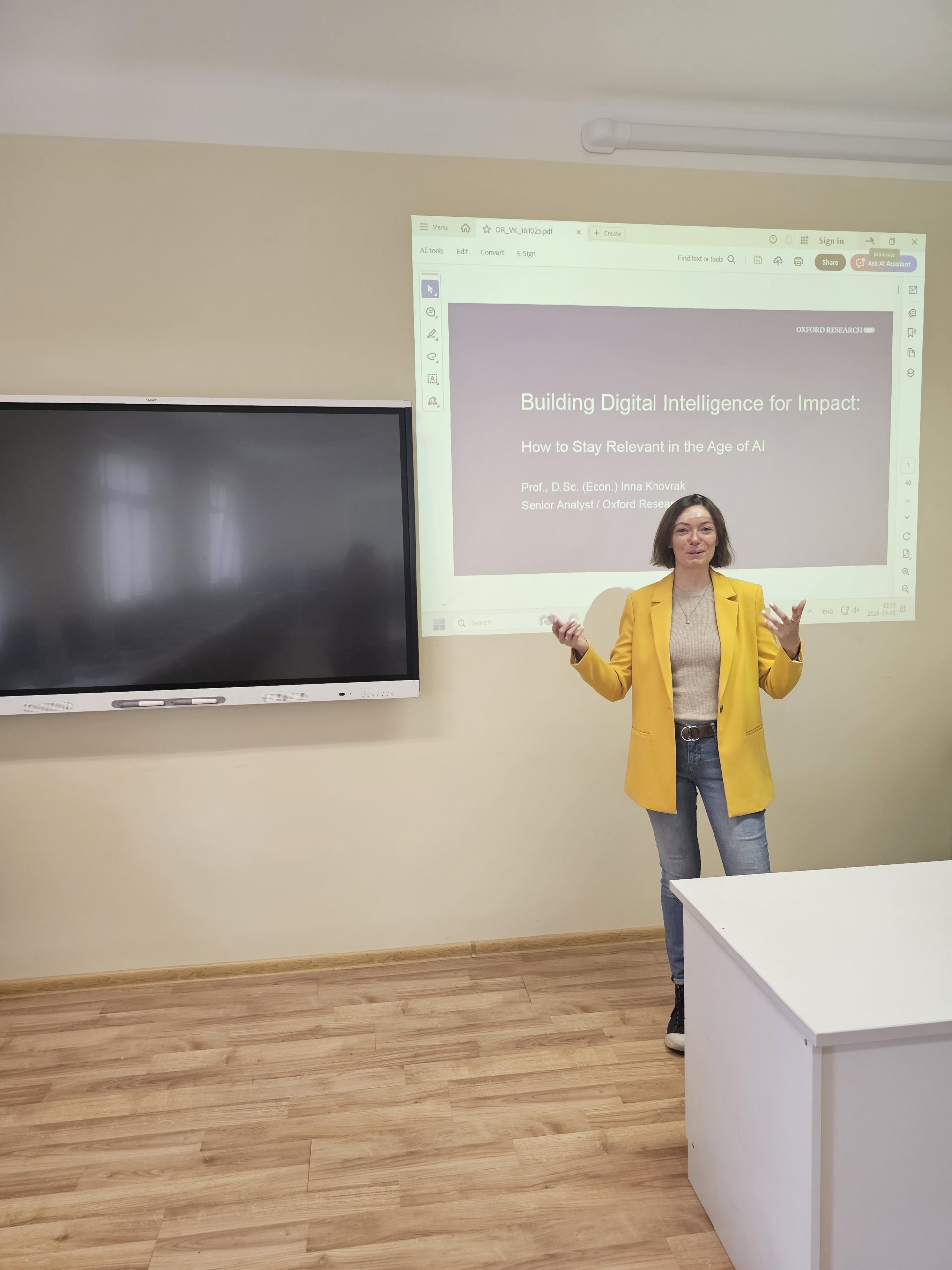 Dr. Inna Khovrak, Oxford Research (Kristiansand, Norvegija) atstovė, pristatė temą „Applying Theory to Practical Problem-Solving: Models of Collaboration Between Higher Education and IT Companies for Developing Digital Skills“. Paskaitoje buvo aptarta, kaip universitetai gali efektyviai bendradarbiauti su informacinių technologijų įmonėmis siekiant ugdyti studentų praktinius gebėjimus ir geriau juos parengti darbo rinkai.