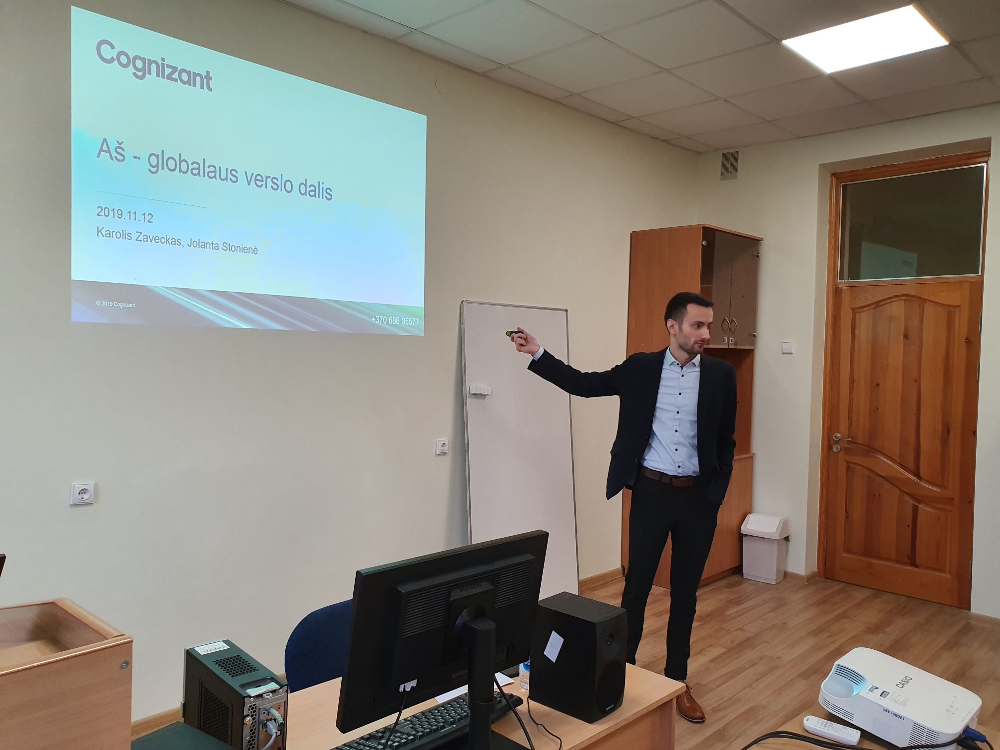 Ekonomikos fakulteto docentės dr. Dainoros Gedvilaitės kvietimu 2019 m. lapkričio 12 d. fakultete lankėsi įmonės „Cognizant“ atstovai Jolanta Stonienė ir Karolis Zaveckas bei skaitė studentams paskaitą „Aš – globalaus verslo dalis“. Paskaitoje dalyvavo Verslo ekonomikos ir Finansų studijų programų studentai. Kartu su lektoriais studentai paskaitoje diskutavo ne tik apie globalizacijos sampratą, jos svarbą šiuolaikiniam verslui ir dėl to kylančias problemas, bet buvo supažindinti ir su skandinaviško verslo kultūra, pačios įmonės socialine atsakomybe. Kalbėta apie įgūdžius, kurių reikės dabartinei kartai ateities versle: lankstumą, nuolatinį mokymąsi, bendradarbiavimą, greitą prisitaikymą prie pokyčių, tarpkultūrinį komunikavimą, kalbų žinojimą. Paskaitos pabaigoje aktyviausi studentai buvo apdovanoti vertingais Cognizant prizais.